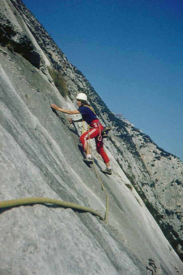 Sonstiges: Die Sonnenplatten sind 1991 mit Klebehaken saniert worden. Hakenabstände bei den älteren Touren durchwegs 5 Meter. Das Foto stammt von 1981, also vor der Sanierung und zeigt den Linksquergang im oberen Wandbereich.