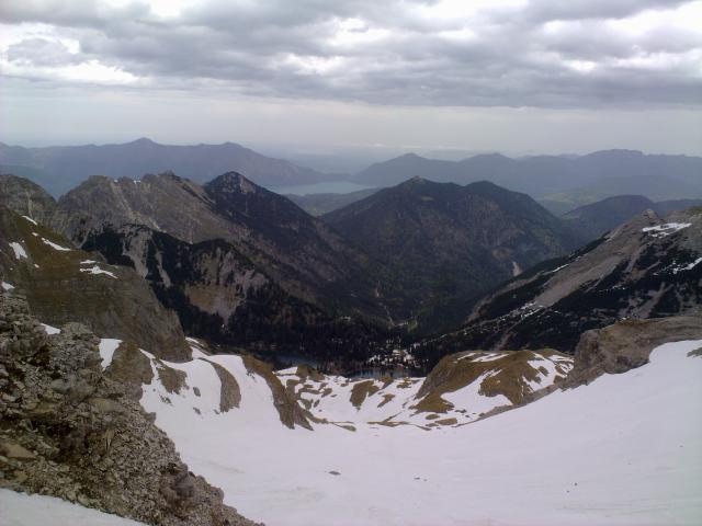 Am Gipfel bis kurz vor Mittag noch ganz gute Sicht, aber von Garmisch drückten schon die Wolken herüber. Die Abfahrt ab dem Sattel bot passablen Sommerfirn. Hält man sich in der Mulde ganz rechts (einige Meter Gegenanstieg), geht es auf letzten Schneeresten noch bis zum Soiernsee. Etwas unangenehm ist dann die Querung (zu Fuß) um den See zurück zum Sommerweg, da es teilweise Blankeis hat und man immer schön genau über dem gierigen See geht ...
