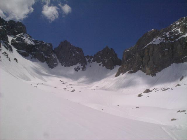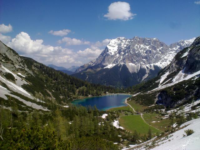 Sonstiges: Heute gab es mal keinen Gipfel zu erklimmen, dafür aber viele schöne Frühsommereindrücke zu erlangen. Von Ehrwald zur Ehrwalder Alm mit dem Radl (Unterstützungsmöglichkeit durch die Ehrwalder Almbahn, Bergfahrt 11 Euro) und weiter in Auf-und-Ab über den am Ende recht schottrigen bzw. grobblockigen Forstweg zur Talstation der Materialseilbahn der Coburger Hütte hinter dem Seebensee. Landschaftlich grandios, auch wenn heute Richtung Cobuger Hütte durch mehrere Gruppen Hochbetrieb (Wanderer) war. Die Kurzski können dank einer bis in den Talboden (1.700 m) reichenden Schneerinne direkt ab dem Radl angeschnallt werden. Unten geht sicherlich bei der Hitze bald der Schnee aus, ab ca. 2.000 m doch noch einiges. Heute ging es nur bis zur Schwärzscharte, Ambitioniertere könnten bei sicheren Verhältnissen auch zur Östlichen Marienbergspitze gehen. Die Abfahrt bot heute oben sehr weichen tiefen Schnee, dann im Flachstück Fahren / Schieben in der Spur, nach unten hin schöne Skimeter. Hält man sich bei der Abfahrt in der Mitte, sind die Hänge schöner, man muss dann allerdings auch mehrfach abschnallen. Bei Querung nach rechts (= wie Aufstieg) ginge bis auf eine Stelle noch durchgehend.