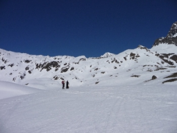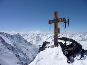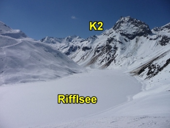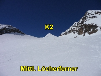 Tourenverhältnisse: Von Mandarfen mit der Gondel auf 2300 m hinauf. Kurze Abfahrt zum Rifflsee, auffellen und flach in das Riffelbachtal hinein. Bald gehts nach rechts (Westen) weiter. Etwas später kommen wir zu den steileren Südhängen bei den Katzenköpfen und erreichen über diese herrliches Skigelände. Beim Schneidigen Wandl halten wir uns links (Westen) und erreichen den Mittleren Löcherferner. Bald sehen wir unser Ziel, eine Miniausgabe des grossen Bruders im Karakorum. Nun über den spaltenlosen Gletscher zum Skidepopt in die Scharte nördlich vom Gipfel. Jetzt noch die letzten 50 Hm zu Fuss über den leicht ausgesetzten Grat hinauf zum kleinen Gipfelkreuz.