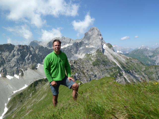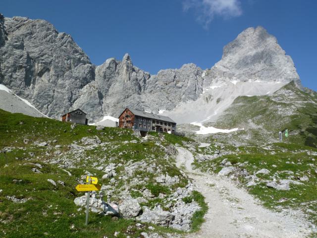 Tourenverhältnisse: Alles trocken und schneefrei. Problemloser Anstieg zur Lamsenjochhütte. Dort gibt es 80 m Richtung Osten auch einen Hinweispfeil zum Schafjöchl. Die exponierte Felspassage (ca. 15 Minuten) ist nie wirklich schwierig (klettertechnisch meist I), erfordert aber gute Nerven und würde keinen einzigen Fehltritt verzeihen. Der Fels ist nicht immer fest.