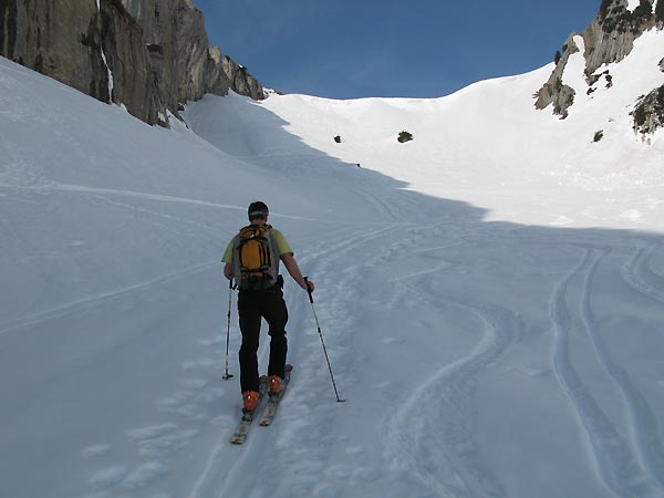 Die Nordrinne (zum Klooaschertal) war noch ohne Spur - oben hat es gut ausgeschaut, nach unten nur noch Lawinenverhau.