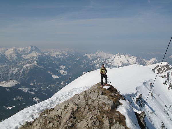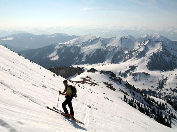 Tourenverhältnisse: Straße bis zur Stallenalm geräumt und aper. Daher muss man ca. 200 Hm über die Straße zu Fuß skitragend. Dann durchgehend Schnee bis auf ein paar wenige Meter im Wald. Beste Verhältnisse. Der südwestseitige Gipfelhang hatte besten Firn zu bieten. Dann zunehmend sulziger Schnee, jedoch sehr gut zu fahren. Perfekt!
