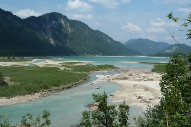 Von dort auf den kurzen Trail und weiter zum Galgenwurfsattel unterhalb des Galgenwurfkopfs. Hier geht es nach links in den flowigen Waldtrail, dem man bis zur Mautstrasse hinab folgt. Auf dieser weiter bis Vorderriss. 500m nach der Brücke geht es links ab in den Isartrail. An der Geschiebesperre der Forststrasse dem Südufer des Sylvensteinsees entlang zur Sylvensteinmauer folgen. Nach der Isarbrücke wieder nach links auf den nächsten Isartrail. Es muss die Hitze gewesen sein, mitten im Nirgendwo ahlt sich eine rabenschwarze Schönheit im Evaskostüm in der Sonne, Euern dehydrierten Korrespondenten haut’s fast vom Bike An seinem Ende auf den Radweg und auf diesem zurück nach Lenggries (680m). Bei Niedrigwasser besser die Isar queren und über Leger zurück wie auf dem Herweg.