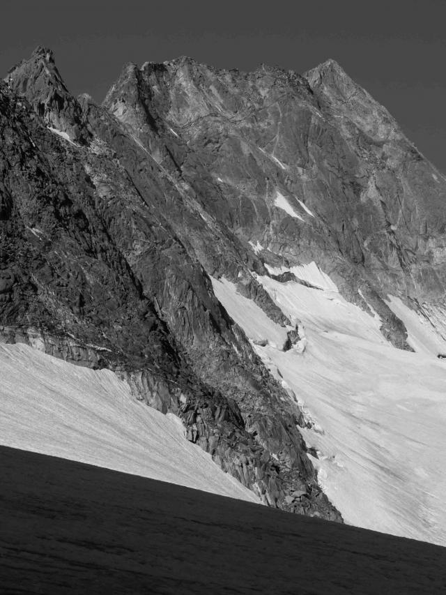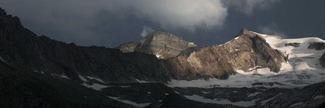 Tourenverhältnisse: sehr warm, Flanken sehr brüchig und kein Eis mehr (auch nicht in der Rinne am "Normalweg" = derzeit SW-Flanke); der Bergschrund unterhalb der Rossruggscharte ist weit offen (Umgehung westlich möglich durch Querung); altes Drahtseil unter Rossruggscharte und 60m Bergseil zum Abseilen auf den Firn (Bergseil derzeit intakt; Drahtseil nicht verlässlich ...); Gletscher gut zu begehen; weicher Schnee durch die Hitze (kein Frieren nachts)