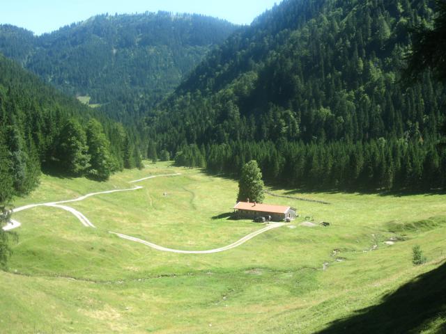 Sonstiges: Mit dem MTB von Kreuth über Schwaigeralm und Langenaualm zur Bayralm und weiter auf der Forststraße bis zu deren Ende, wo früher die Bayrbachalm stand und der Fußweg zur Halserspitze weiter führt (ca. 1230m). Zurück den gleichen Weg, wobei wir ab der Langenaualm den offenbar dieses oder letztes Jahr neu erbauten Singletrail, der parallel zur Forststraße hinab führt, benutzten. Viele Wurzeln, (zur Zeit) einige Kuhlen mit Schlamm und ein paar Gräben zum Überqueren lassen das Ganze holperig, aber kurzweilig werden. Eine gewisse Übung wird vorausgesetzt und schadet auch nicht. Wir hatten diese Übung nicht und bauten zwei (harmlose) Stürze. Dennoch hat der Trail gerade meinem 12-jährigen gut gefallen. Ist wohl Geschmackssache, ob man den Trail runter holpert oder die Straße runter saust. Zur Zeit bietet sich ein erfrischendes Bad im Tegernsee nach der Tour an. Wetter ganztägig wolkenlos, sehr warm.