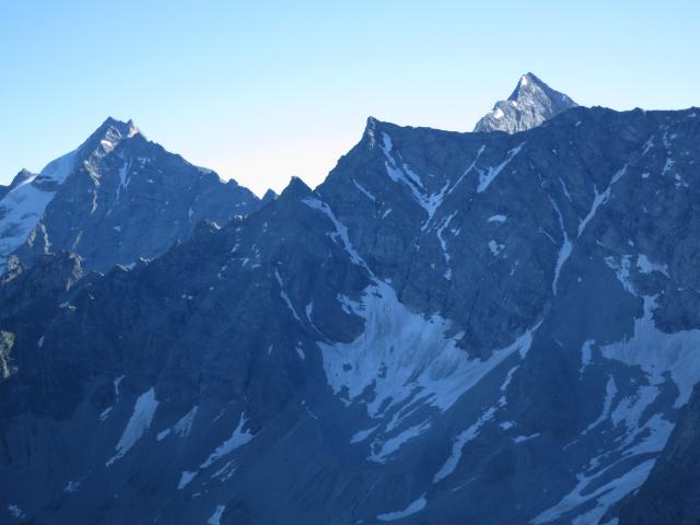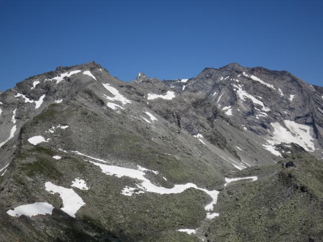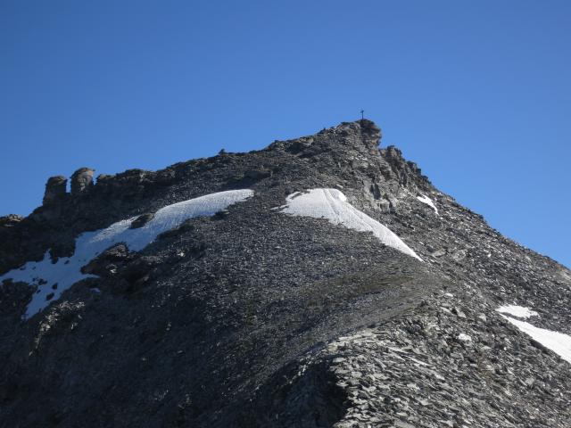 Kraxentrager: gleich bei der Querung in 2750 m ist noch ein kleines Schneefeld zu queren und kurz unter dem Gipfel muss man noch ein Schneefeld aufsteigen (könnte auch etwas mühsam links davon umgangen werden).