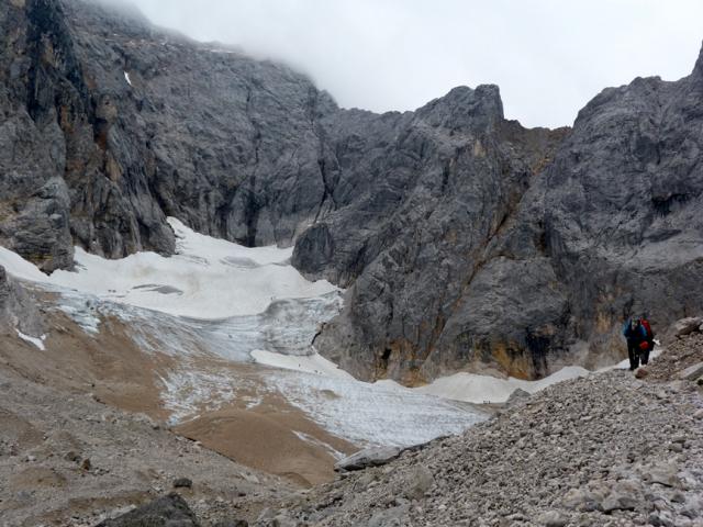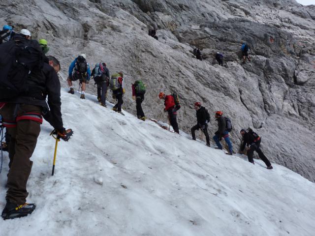 Höchster Punkt: Zugspitze, 2962 m Art der Tour: Bergtour Datum der Tour: 31. August 2013 Gebirge: Wetterstein Ausgangspunkt: Hammersbach bzw. Höllentalangerhütte (die ab dem 16.9. bekanntlih abgerissen und bis 2015 komplett neu gebaut wird) Tourenverhältnisse: Heute war recht viel los - Höllentalangerhütte brechend voll, um 5 Uhr waren die Ersten schon am Brett vorbei. Insgesamt schätzungsweise 250 Leute unterwegs. Gletscher recht gut zu gehen, Steigeisen und Pickel aber ratsam. Circa 30 Minuten an der Randkluft - es gibt nur einen schmalen Übergang zum linken Drahtseil. Am Gipfel der übliche Hype mit Sandalentouristen-Gegenverkehr. Gefahreneinschätzung: Bleibt immer eine ernsthafte Bergtour. Prognose: Gletscher wird nächste Woche verstärkt ausapern bzw. eisiger werden (heute teils noch angenehm weiche Neuschneeauflage). Sonstiges: Am Jubiläumsgrat gab es auf Höhe des Höllentalferners offenbar ein tödliches Unglück. Gegen 10.45 Uhr hat ein Polizeihubschrauber eine Leiche geborgen. Der Bergsteiger (offenbar ein 61 Jahre alter Belgier) war vom Jubiläumsgrat 150 bis 200 Meter Richtung Höllentalferner abgestürzt.