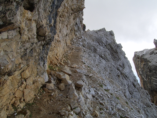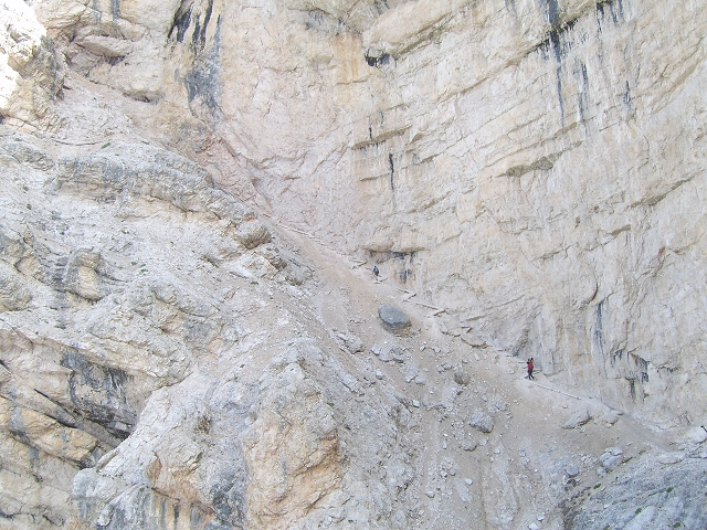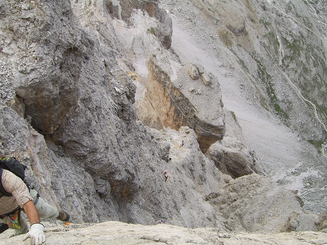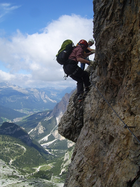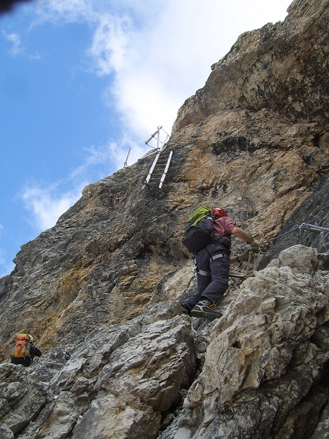 Tourenverhältnisse: Auffahrt mit der Seilbahn (10,50 €) zum Lagazuoi. Über die karstige Hochfläche der Alpe di Lagazuoi erstmal Abstieg und Querung zum Fuß der Fanes-Spitzen; dort teils steiler Aufstieg im Schutt (Steig vorhanden) zum Bivaco della Chiesa; dort beginnt der Tomaselli-Klettersteig unterhalb der alten Kriegsleitern. Dickes Stahlseil, an Vertrauens-erweckenden Verankerungen; schaut alles ziemlich neu aus; kaum künstliche Tritte; auch mal ungesichert auf einem Band aufwärts; etliche senkrechte Stellen, vor allem gegen Ende des Steigs; Abstieg vom Gipfel nach Osten über leichteren Klettersteig (B mit Stellen C) ca. 150hm in eine Scharte; von dort eine sehr steile Geröllrinne (Steinschlag!) mehr oder minder weglos nach Süden ca. 120hm hinunter bis man auf einen besseren Steig trifft; ab hier verschiedene Möglichkeiten zur Rückkehr zum Falzarego-Paß.
