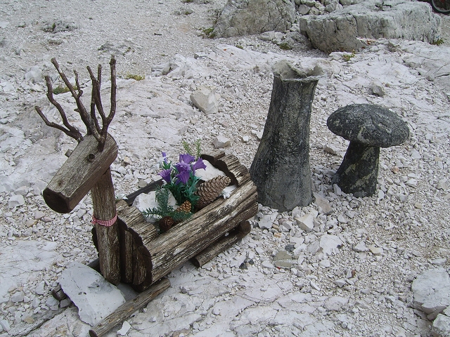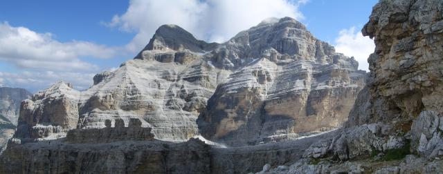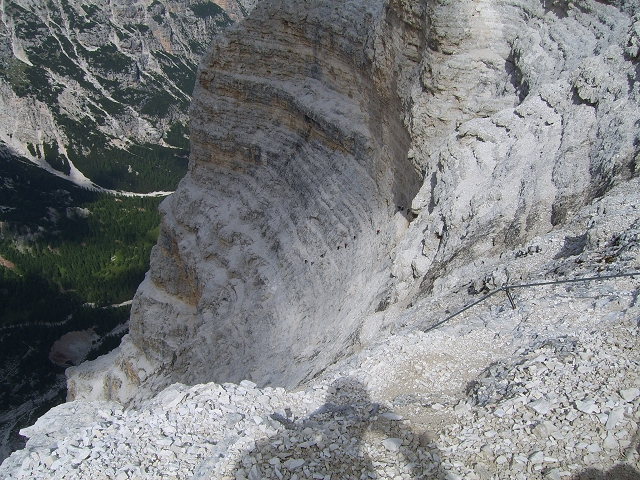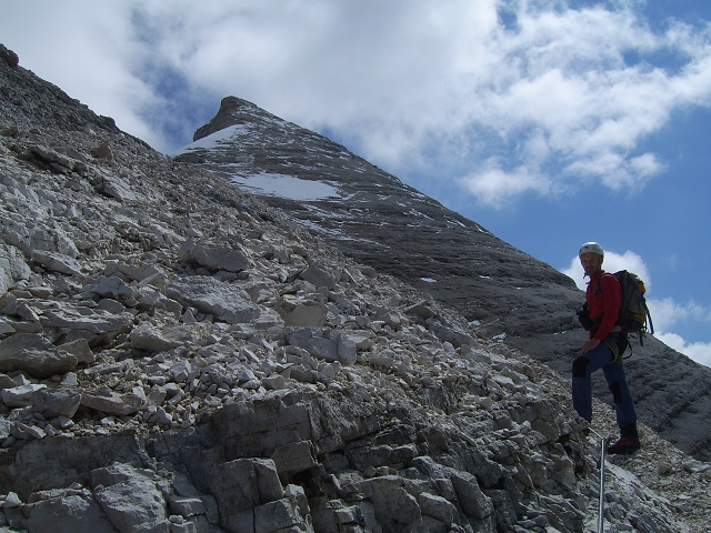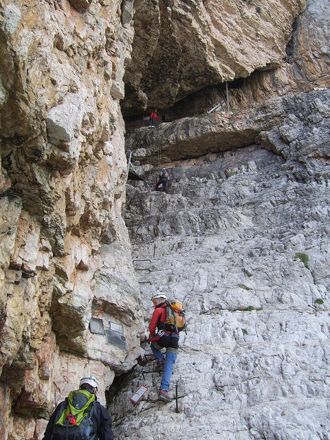 Tourenverhältnisse: langer Klettersteig mit einem Highlight gleich zu Anfang: ein ca. 400m langer und steiler alter Kriegs-Stollen. Nach dem Tunnel absteigend in die Westwand (hier auch ein Notabstieg), wo man bald ein steiles und hartes Schneefeld queren muß (Zacken an den Füßen sind zumindest in der Früh kein Luxus); über ein Band im Gehgelände weiter bis zum eigentlichen Beginn. Über Steilstufen und Bänder (meist absteigend) die gesamte Westwand querend bis zu zu einem Rastplatz beim Felsgebilde Tre Dita (2694 m); hier auch ein Notabstieg zum Rifugio Giussani. Weiter gehts Richtung Süden auf einem Band (Gehgelände) bis zum letzten, langen Steilaufschwung. Hier kommen noch die Hauptschwierigkeiten, da an einigen sehr steilen Stellen von oben die Dusche kommt (deshalb m.M. auch D); über einen letzten Aufschwung und ein Band aufwärts bis man auf den Normalweg trifft. Von hier noch ca. 200hm zum Gipfel. Der Gipfelsteig ist aktuell schnee-bedeckt; zur Mittagszeit wars zwar glitschig, jedoch problemlos zu begehen. Abstieg zurück zur Weggabelung und nach Osten weiter im schlecht markierten Schrofengelände zum Rifugio Giussani (2600 m); von dort nach Süden auf breitem Weg bequem zurück zum Rif. Dibona.