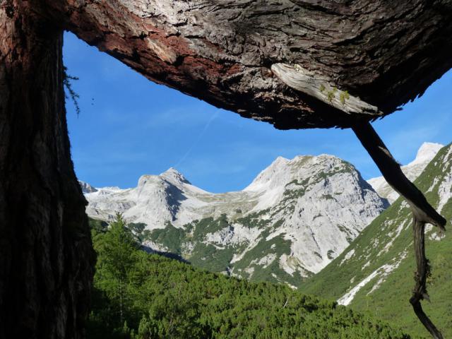 Tourenverhältnisse: Mit dem Rad durchs morgens sehr frische Hinterautal an der Kastenalm vorbei bis zum Moserkarbach, zu Fuß zum Gipfel. Routenfindung einfacher als erwartet, aber trotzdem drei kleine Verhauer. Nur wenige, kleine Schneefelder im obersten Moserkar und am Gipfelaufbau.