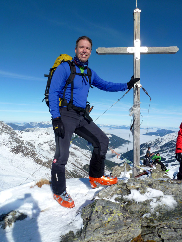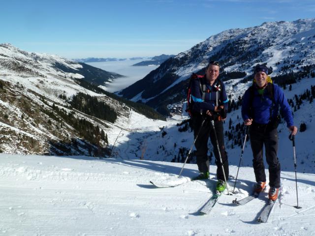 Tourenverhältnisse: Start oberhalb der Nebelsuppe und mit genug Schnee am dem Parkplatz. Pisten wurden zum Teil schon mal gewalzt (es ist aber noch kein Skibetrieb), sodass es keine Kratzer im Belag gab. Schöner Tiefschneehang (Pulver) mit genug Unterlage am Schlepplift bei der schwarzen Piste Nr. 7. Gipfelanstieg gespurt. Insgesamt ca. 250 Leute unterwegs.