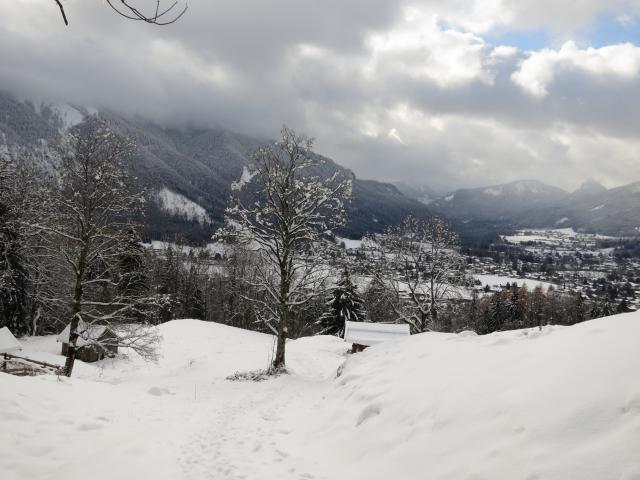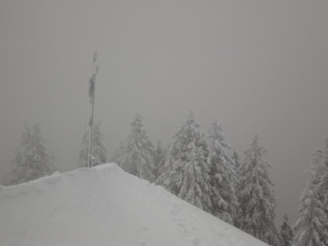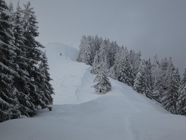 Waren es anfangs nur wenige cm Schnee auf matschigem Untergrund, wurde der Schnee nach der Riederstein-Kapelle doch deutlich mehr: so um die 30 bis 40 cm werden es wohl gewesen sein. Der Gipfelhang war teils abgeblasen, teils stärker eingeweht. Insgesamt war es in dem Pulverschnee nur mit Bergschuhen (also ohne Schneeschuhe) noch recht gut zu gehen; zudem war eine einigermaßen eingetretene Spur vorhanden. Im Gipfelbereich war's recht windig und dadurch ungemütlich.