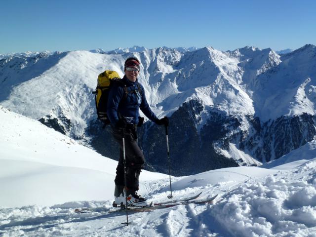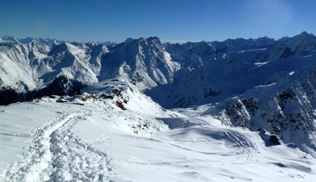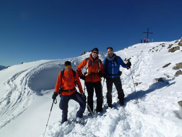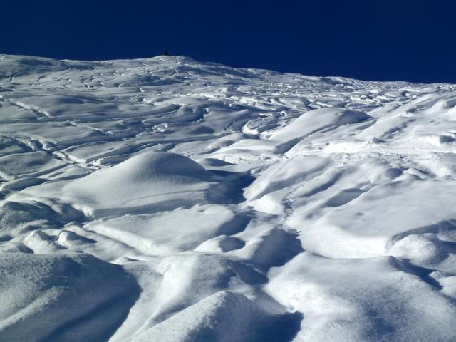 Gefahreneinschätzung: Gegen 13.15 Uhr hat ein einzelner Tourengeher, der mit Skiern bis zum Gipfel gegangen ist, in der Abfahrt im steilen Gipfelhang (nördlich vom Skidepot) ein Schneebrett ausgelöst, blieb aber quasi auf den Steinen stehen - der Hang ist jetzt abgeräumt. Entlang der Aufstiegsroute weitgehend stabile Verhältnisse.