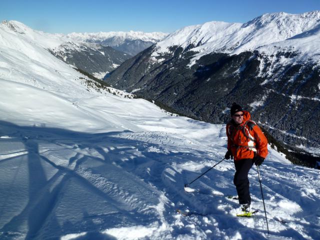 Tourenverhältnisse: Rodelbahn ist präpariert (= steinfreie Abfahrt ab ca. 2000 m). Ansonsten durchweg super Pulver vom Gipfel bis zum Parkplatz, teils knietief und mehr; aber ein paar Steine haben wir gestreichelt, ernsthafte Belagschäden gab es aber nicht. Für Anfang Dezember schon gute Bedingungen. Bei wolkenlosem Himmel heute tolle Fernsicht. Aber kalt war's, Start am Parkplatz bei elf Grad minus.