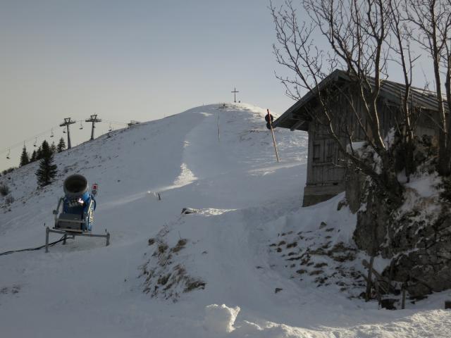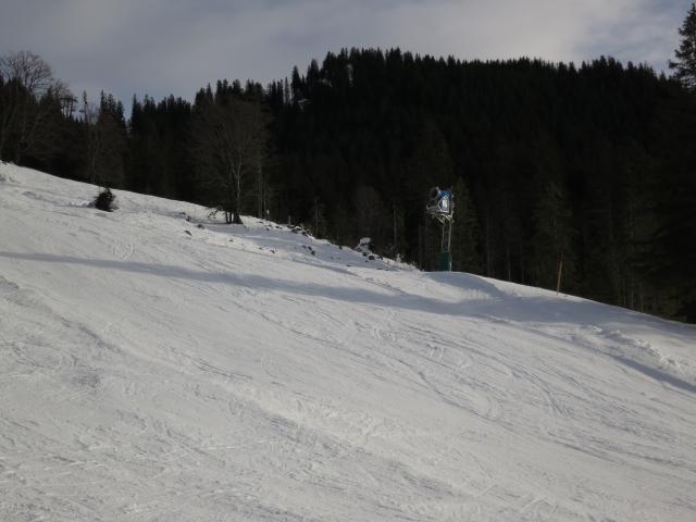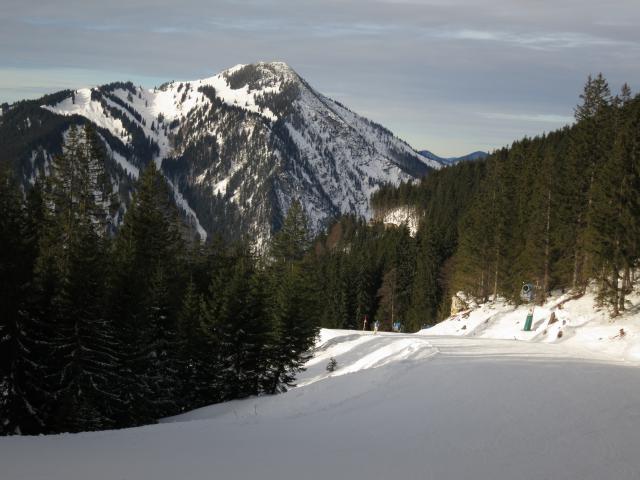 Tourenverhältnisse: Abfahrt überwiegend auf einer glattgebügelten Piste. Ein paar Steinchen gab's nur in Gipfelnähe; der Rest war (wegen Beschneiung) ohne Feindberührung. Die Suttenbahn und der Roßkopflift waren schon in Betrieb. Der Andrang auf der Piste hielt sich aber sehr in Grenzen.