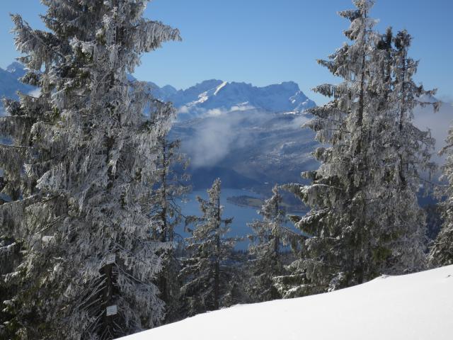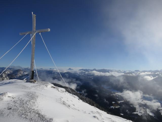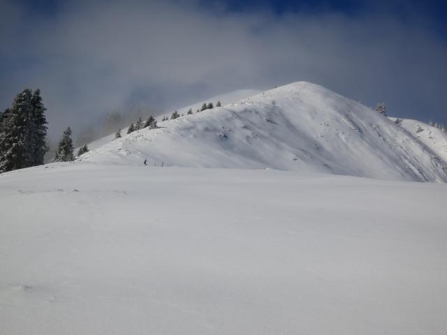 Tourenverhältnisse: Neuschnee anfangs Null, im Gipfelbereich auch nur im einstelligen cm-Bereich (teils windgepresst). Im Wald ist der wenige Schnee auf warmen, aperen Boden gefallen. Grödeln waren kein Thema. Im Abstieg war im Waldbereich schon wieder Schneematsch, teils auch feucht oder batzig. Insgesamt aber alles gut zu gehen.