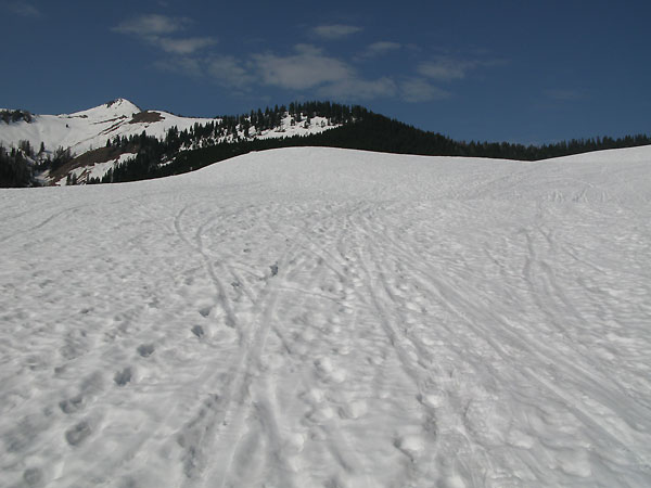 Der Hang zur Falkenmoosalm hat noch viel Schnee und war auch gegen Mittag noch gut zu fahren. Durchgehend viel Schnee bis zum Gipfel; bei richtigem Timing schöner Firn mit Abfahrt bis zum Auto!