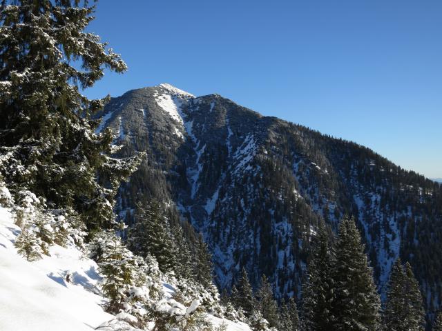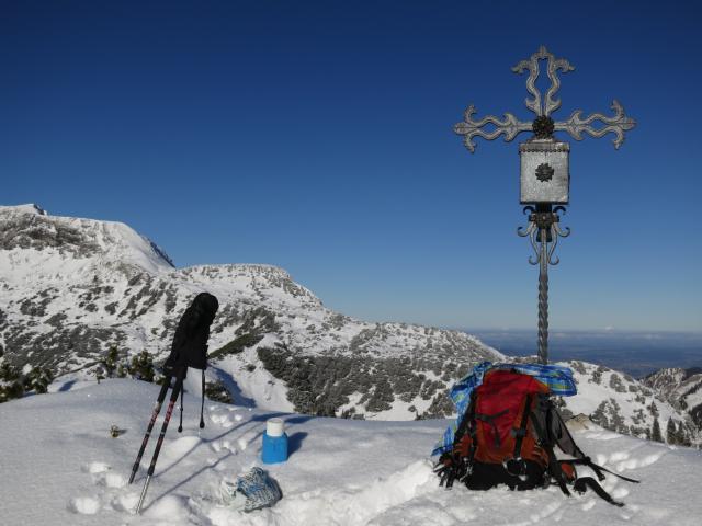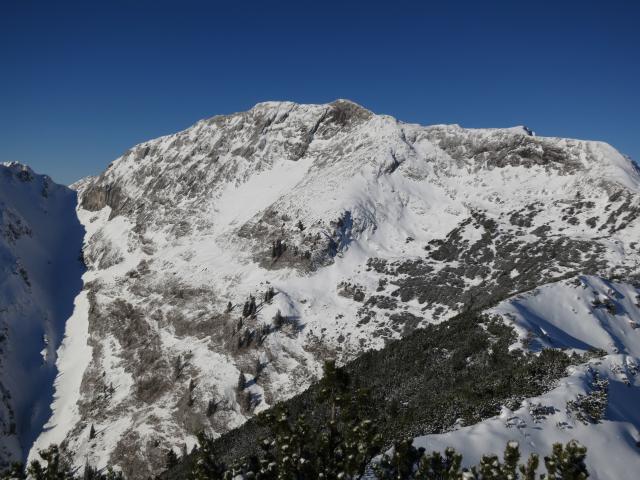 Tourenverhältnisse: Forststraße schneebedeckt, dann am Wanderweg weiter - teils schneefrei, teils geringe Neuschneeauflage - bis zu einer Hütte (Weit Alm). Ab hier wird der Schnee dann mehr; geht aber noch ohne Schneeschuhe; nur selten bricht man im Latschenbereich ein. Die vorhandene Stapfspur von einem der Vortage konnte ich allerdings nur als Orientierungshilfe verwenden, da sie wieder zugeweht war. Grödeln waren nicht nötig, da es auf der gesamten Tour keine eisigen Abschnitte gab.