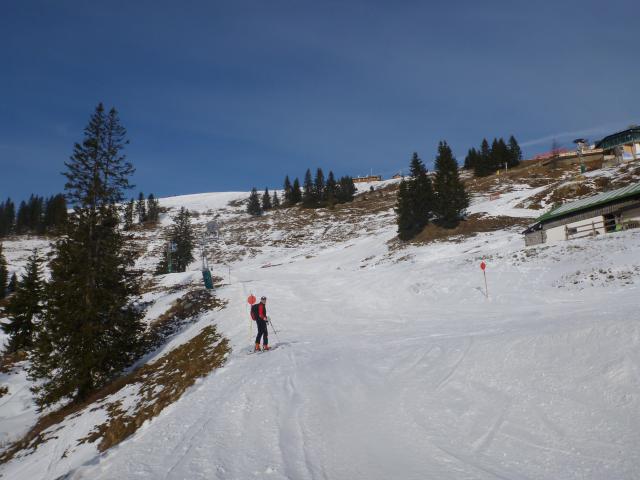 Tourenverhältnisse: aufgrund des Schneemangels Pistentour, Abfahrt nach Wegscheid gesperrt, deshalb ohne Gefahr machbar, Piste sehr hart, teilweise große Eisplatten, nach Florilift Tragestelle, Tritte waren in der Früh alle gefrohren und unangenehm zu gehen...