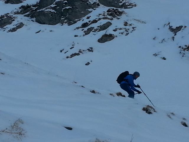 Die Abfahrt über den Westhang in´s Rohntal war oben in den Rinnen noch möglich. Kein Steinkontakt. Aus dem Kessel zum Talboden ist es in der Abfahrtsspur mit Vorsicht eigentlich ok, für die derzeitigen Verhältnisse. Hier gelegentlich Steinkontakt. Es wird eng um die Steine gekurvt. Im Flacheren gehen wieder ein paar schöne Schwünge. Dann flott in der Spur über die Ebene zur Forststraße- Diese lange abgeschwungen. Die letzten 15 min auf der Forststraße abgegangen.