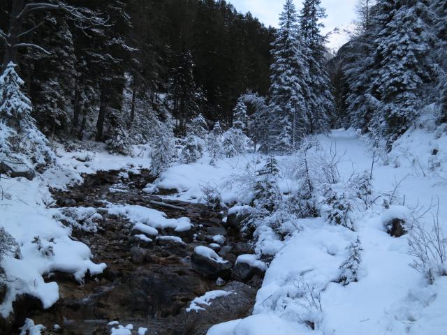 Heute auf der gesamten Tour (von einem kurzen Stück zu Beginn auf der Forststraße) kein Eis und kaum glatten Schnee; Grödeln nicht erforderlich.