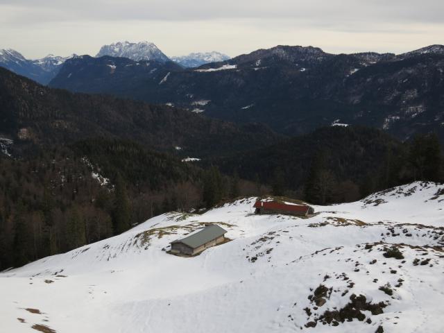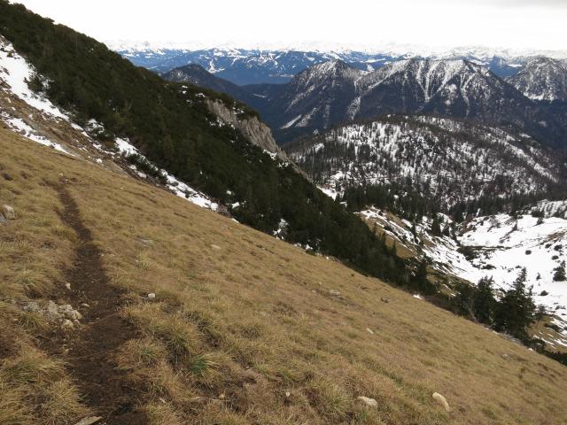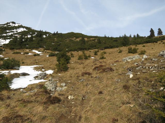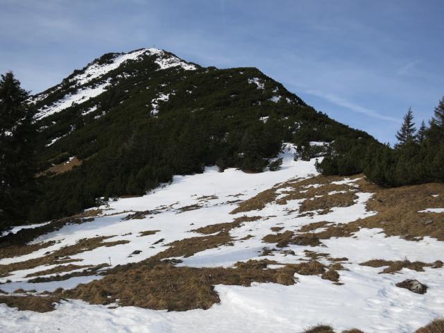 Tourenverhältnisse: für eine Winterwanderung perfekt. Aufstieg über Veitsbergalm: Forststraße teils aper, teils schneebedeckt, kaum Eis. Weiterweg bis zur Gratkante ohne Schneeberührung möglich (Bild 1). In der Gipfelflanke lag dann zwar Schnee (Bild 2); jedoch war eine feste, tragende Fußspur vorhanden. Der (tiefe) Schnee nordseitig rechts von der Spur war allerdings bis zum Grund durchfeuchtet. Abstieg über Riedebenalm: vom Gipfel bis kurz vor der Alm weitestgehend schneefrei (Bild 4). Nur vor und nach der Alm durchfeuchteter Schnee (Bild 5; Spur vorhanden). Danach wieder aper mit kurzen Schneeabschnitten. Heute eine recht einsame Tour.