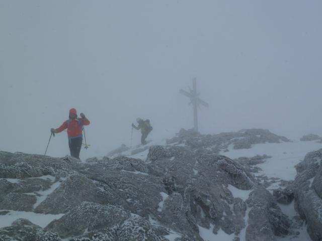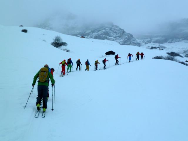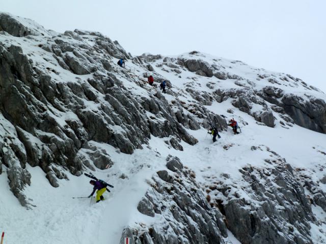 Tourenverhältnisse: Vom Parkplatz weg genug Schnee, insgesamt trotzdem wenig Schnee. Nach dem Hüttenzustieg am Donnerstag im Sonnenschein herrschte am Gipfel-Freitag leider Schneetreiben mit Nebel; immerhin gab's ein paar cm Neuschnee. Meist Pulver, manchmal windverpresst, streckenweise sehr dünne Schneedecke (Vorsicht Steine!), teils auch knapp knietiefe Pulverpassagen. Das Kletterstück (ca. 50 Hm) ist gut eingetreten und problemlos zu gehen.