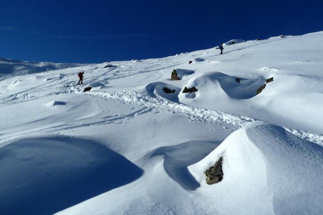 Tourenverhältnisse: Bis zu 15cm Neuschnee auf tragfähiger Unterlage, schon frühlingshaft, Gipfelaufbau abgeblasen, pistenmäßig eingefahren, etliche Steine schauen oben wieder raus, unten besser als oben, Abfahrt bis zum PP