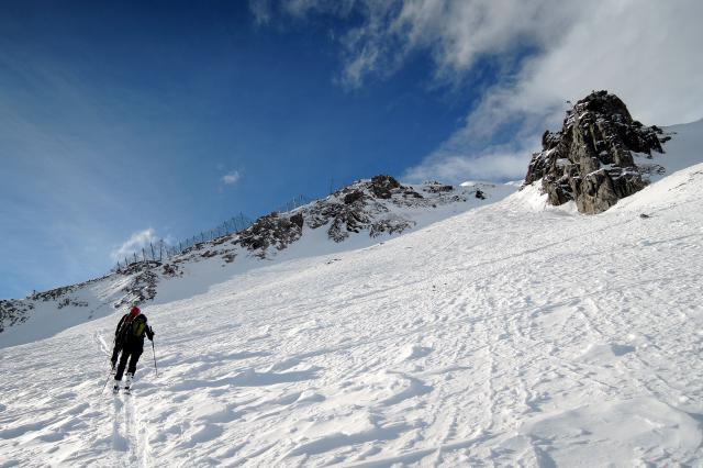 Sonstiges: Vom PP Hotel Tyrol (1010m) neben bzw. über die blaue 8b zur Bergstation der Grubig II Bahn (1320m). Dort rechts auf der roten Piste zur Wolfratshauser Hütte (1751m) und weiter zur Bergstation der Skihüttebahn (1920m). Von dort durch die Latschen etwas steiler in einigen Kehren zur Grubighütte (2050m). Weiter über den Osthang mit Ski zum Gipfel (2175m). Niemand oben… Runter wieder ohne Steinkontakt