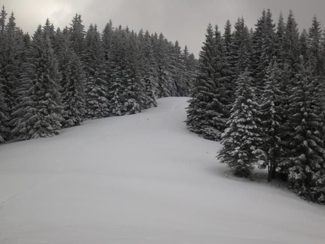 Vom Parkplatz weg 1 cm Neuschnee, im Wald dann so knapp 5 cm und kurz unterm Gipfel bis 20 cm. Der Schnee liegt direkt auf Wiesen-/Erduntergrund. Im Abstieg anfangs in der Lichtung auch so um 20 cm Neuschnee (Bild 2), der nach unten hin immer weniger wurde. Insgesamt gut zu gehen, auch wenn's weiter unten abschnittsweise rutschig war (wenig Neuschnee auf batzigem Untergrund); weder Grödeln noch Schneeschuhe nötig. Allerdings hat das Zwischenhoch wohl in größeren Höhen stattgefunden. Dafür war's heute eine schöne und einsame Winterwanderung.