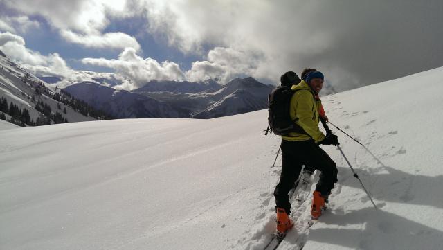 Da es hier eine Unterlage hatte, haben die Neuschneefälle ausgereicht, um heute für perfekte Verhältnisse zu sorgen. Um 11.30 Uhr wurden die ersten Abfahrtsspuren in den Hang gelegt und auch wir hatten eine halbe Stunde später noch viiiel Platz im Pulver zu schwelgen. Weil's so schön war sind wir noch Richtung Retherkopf aufgestiegen und über die Kleinzemmalm abgefahren.