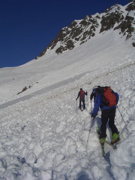 Tourenverhältnisse: Aufstieg von Lüsens aus über das Westfalenhaus. Unbedingt Harscheisen mitnehmen! Gesamte Spur war sehr vereist. Geht man nach dem Westfalenhaus auf der rechten Talseite bis zum Winnebachjoch muss man 2 große Lawinen überqueren (Bild). Evt. links vom Tal zum Winnebachjoch gehen. Abfahrt um 10:00 teilweise Firn, Osthänge zum teil faul, Flachstücke Pistenartig.