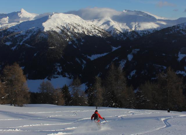 Tourenverhältnisse: Im Obernbergtal liegt eine Unterlage, von der man in den bayerischen Alpen nur träumen kann. Der darauf liegende Neuschnee der vergangenen Tage ist sehr unterschiedlich: Im Wald wunderbarer Powder, auf Kämmen und Rücken stark verblasen und in Triebschneemulden lawinentechnisch heikel.