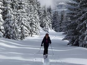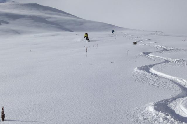 Gefahreneinschätzung: subjektiv gering. Trotz Osthängen hatten wir nicht den Eindruck, dass es dort Triebschnee gibt. Wahrscheinlich hat es alles weiter runter geweht. Am meisten Neuschnee im Waldbereich oberhalb der Falkenmoosalm.