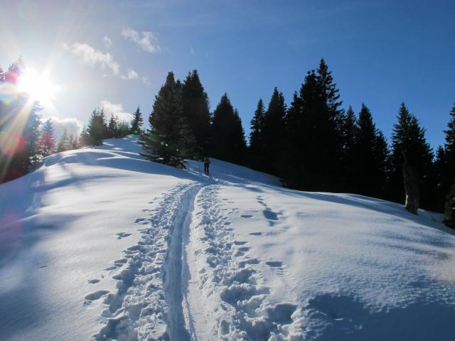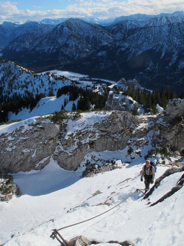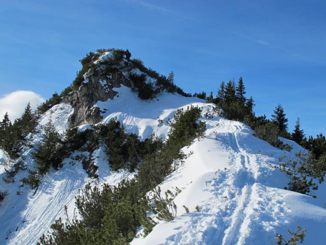 Auf der Rodelbahn und beim Waldaufstieg ausreichend Schnee. Am Latschengrat trotz des wenigen Schnees problemloses Durchkommen. Gipfelanstieg einfach zu begehen - Seil ist frei.