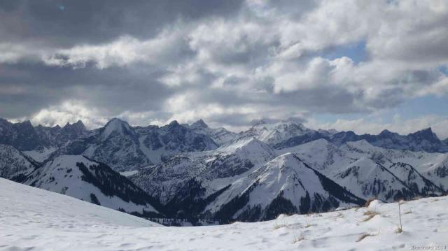 Tourenverhältnisse: Anstieg mit Fellen vom Parkplatz weg bis 50 Hm unter den Gipfel möglich, der Gipfelhang hat viel zu wenig Schnee. Der Föhn hat die Schneedecke schwer und stumpf gemacht, aber noch relativ gut fahrbar. Insgesamt gute Bedingungen, kaum Steinkontakt. Die Forststraßen sind gut schneebedeckt. Das herrliche Karwendel-Panorama hat für den fehlenden Pulverschnee entschädigt.