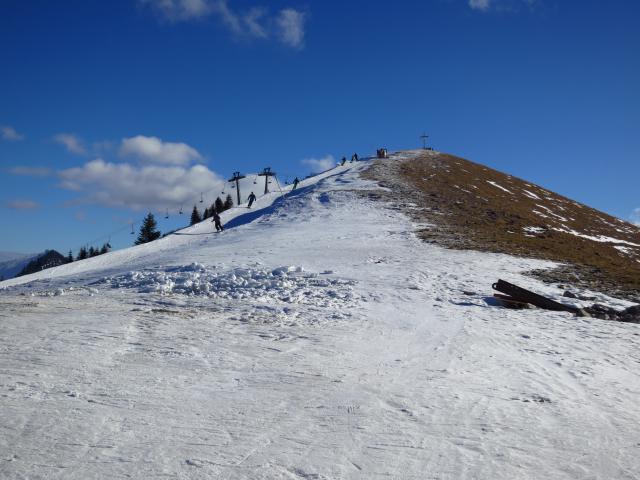 Tourenverhältnisse: Aufstieg am Pistenrand (in den Waldabschnitten lag so gut wie kein Schnee). Abfahrt mittags auf glattgebügelter, abschnittsweise auch abgeschabter Piste ohne Steinkontakt. Sonniges Wetter und relativ viele Pistler unterwegs. Die Grünseeabfahrt war offiziell gesperrt (die Mehrzahl der Tourengeher, die in der Zeit meiner Gipfelrast von dort aufgestiegen sind, sind dann über die Stümpflingpiste abgefahren).