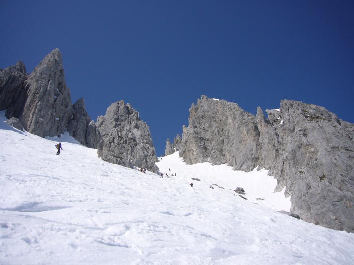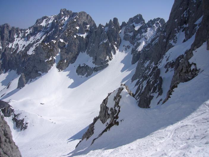 Abfahrt bei schönem Firn. Kar wurde über Ostern pistenmäßig eingefahren. Sehr gute Verhältnisse.