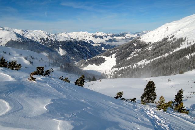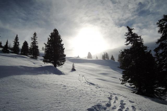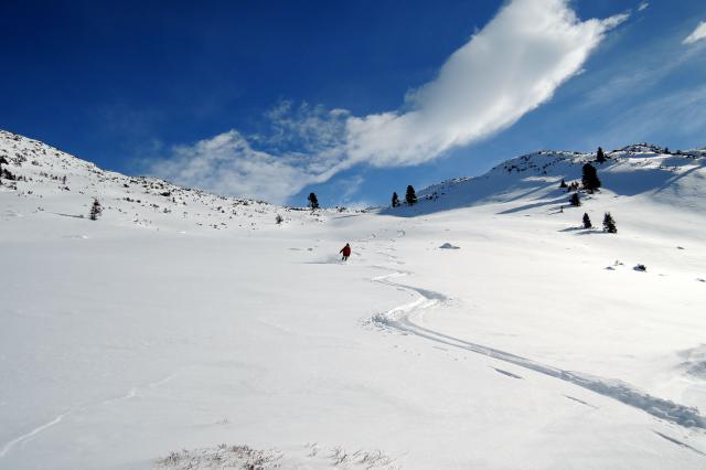 Tourenverhältnisse: Vom PP weg Pulver (frisch 10-15cm), im Wald teils mehr. Im freien Gelände Triebschnee, weiter oben gebunden mit Rißbildung in steilen Passagen. Für die rassige Variante ein klares NO GO!