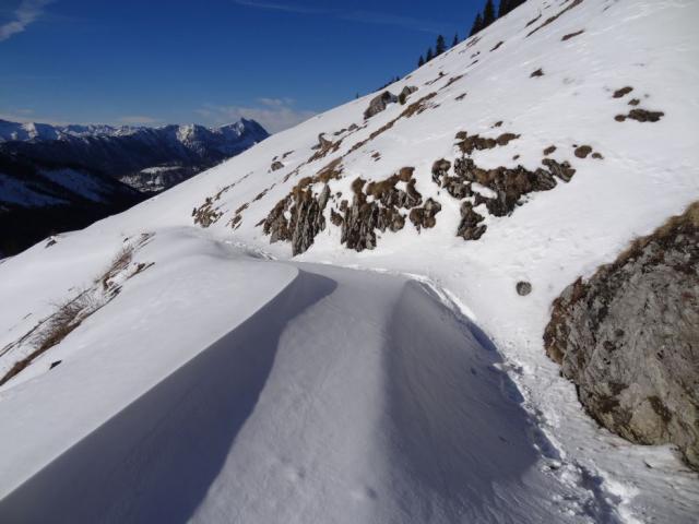 Tourenverhältnisse: Da das hintere Sonnwendjoch im Sommer meist hoffnungslos überlaufen ist, lohnt sich die Besteigung im Winter. Dazu muß man aber die komplette Mautstraße zu Fuß gehen (ca. 1,5 Std.). Allerdings ist die Straße durchaus schön zu gehen. Bin im Aufstieg über den Sommerweg und Steinkaseralm gegangen. Hinter der Alm auf eine Forststraße, die gut mit Schneeverwehungen bedeckt ist. Oberhalb verliert man dann zwangsweise den Weg, allerdings ist die Orientierung problemlos. Abstieg dann über den Schnittlauchgraben. Vorsicht, am Anfang ist der Abstieg wirklich recht steil.