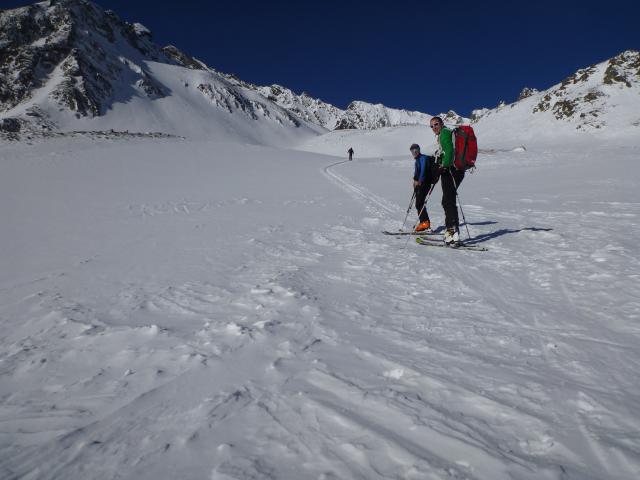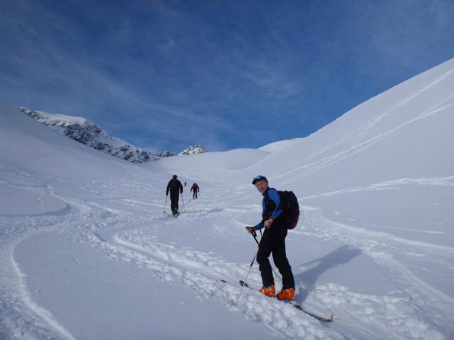 Tourenverhältnisse: vom Parkplatz weg ausreichend Schnee, bis ca. 2450 m Pulver, darüber abgeblasen bzw. windgepresst. Aufstieg bis 2900 m mit Ski, dort Skidepot und zum Gipfel zu Fuß, im Laufe des vormittags zunehmender Wind, schöne Abfahrt durch die Mulde, ab ca. 2000 m Schnee schon recht weich...