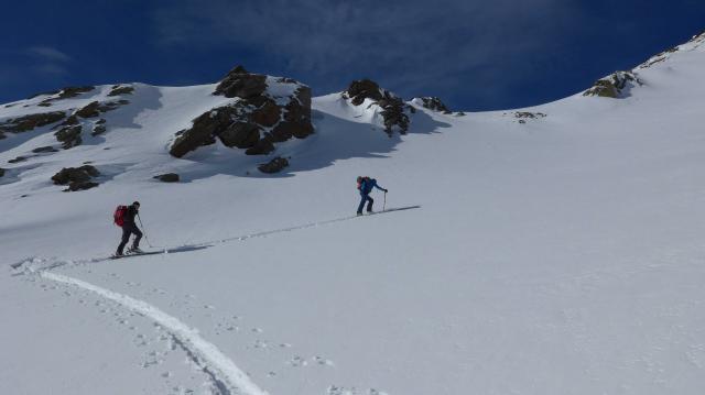 Sind bis ans Ende des kleinen Kar´s zur Rotgrubenspitze gegangen. (3014 m), wollten diese noch besteigen. Ab der Scharte ausgesetzte Kletterei schneefrei (markiert) mit Skischuhen kurz unter dem Gipfel - umgedreht (war uns zu heikel). Nun das kleine Kar etwas abgefahren, um möglichst hoch zur Scharte queren zu können.