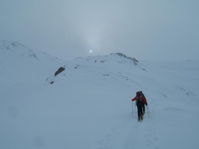 Tourenverhältnisse: vom P weg bei leichtem Schneefall 10cm Neuschnee , in der Folge bis gut 30cm ansteigend; meist auf hartem Untergrund, manchmal auch direkt auf Gras vorallem unterhalb der Viertelalm Niederleger; unterhalb des Kammbereiches gebundener Schnee. leichte Aufhellungen im Aufstieg, am Gipfel leider im Nebel, der dann auch die Abfahrt beeinträchtigte (teilweise whiteout);