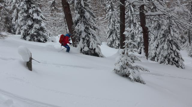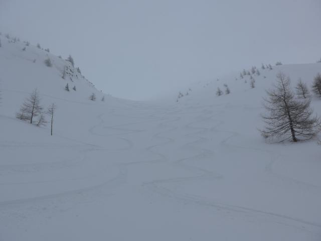 Macht nix! Wir hatten mächtig Spaß, nach 150 Hm hatten wir wieder deutlich bessere Sicht und genossen juhezend den Pulverschnee, später durch schönen lichten Lärchenwald. Herrliche Abfahrt.