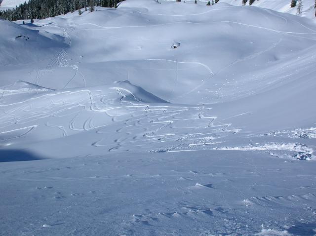 Tourenverhältnisse: Von der Koberalm bis um Gipfel herrlicher Pulver (15 - 35 cm) auf festem, aber zerspurtem Untergrund. Optimale Bedingungen, da windstill und klar. Der Nordhang des Breiteggern hat feinsten, lockeren Pulver.