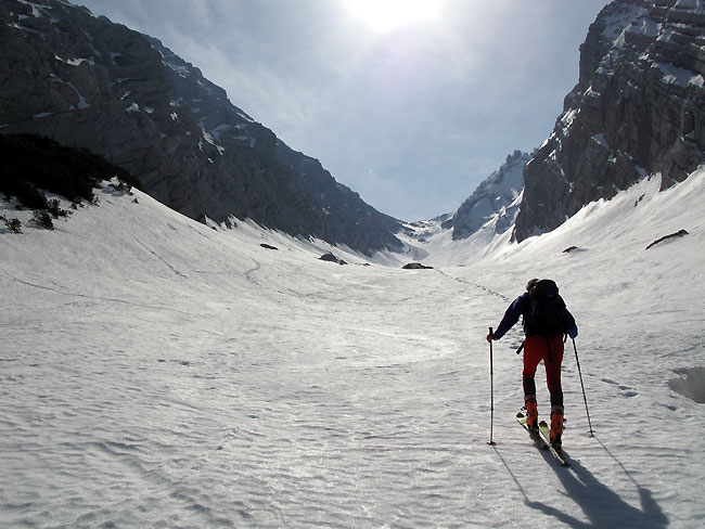Tourenverhältnisse: Beim Ofental muss man die Ski fast bis zum Kar tragen (gut 500 Hm, ca. 1,5 Std.) - beim Steintal kann man ein Stück früher anfellen und ein Stück weiter abfahren.