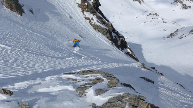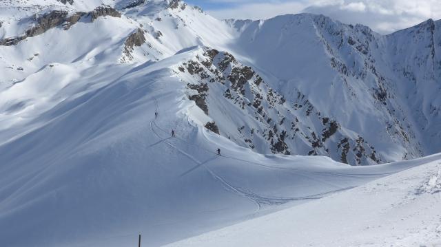 Tourenverhältnisse: Nicht üppig Schnee, doch ausreichend. Bis auf die Abfahrt vom Geier (feinster Bruchharsch) sind die Nord + Osthänge pulvrig. Südseitig morgens sehr hart, später firnig. Rippen, Grate und Geländekanten oft abgeblassen.