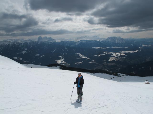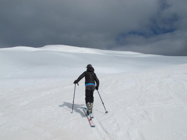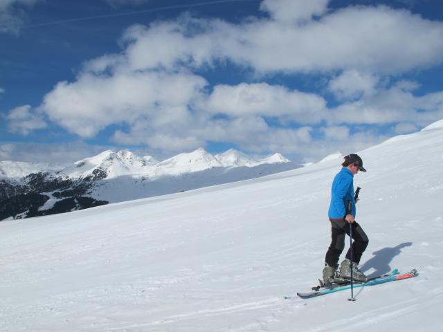 Tourenverhältnisse: Trotz Sonnseite,ausreichend Schnee ab Ausgangspunkt. Wir haben auf Firn spekuliert und unser Plan wäre fast aufgegangen. Leider kamen am späten Vormittag dicke Wolken, so dass es um MIttag noch nicht auffirnte. Ganz oben gab es eine dünne Pulverschicht, war ganz gut zu fahren. Dann tragender Harschdeckel mit einigen wenigen Pulverflecken dazwischen. Nur der Bereich mit viele alten Spuren war etwas ruppig, ansonsten war die Abfahrt überweigend OK.