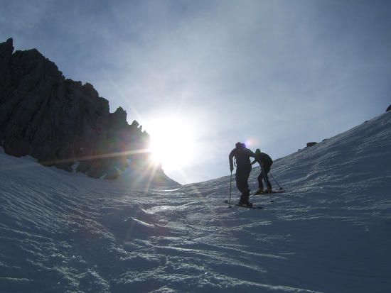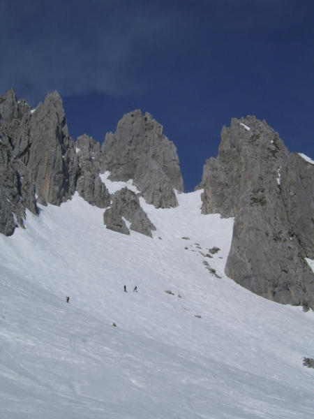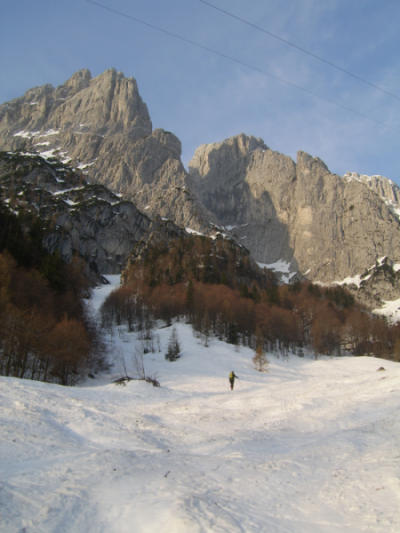 Tourenverhältnisse: von unten weg in der Früh schon weich; wurde dann zunehmend fester so daß bei der Abfahrt dann (zumindest bis zum Waldgürtel) schöner Firn vorhanden war. Unten sehr sulzig. Die Steilstufen sind Buckelpisten-mäßig eingefahren, ist lästig im Aufstieg, in der Abfahrt hat's was...